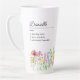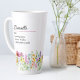 Wildflower latte mug with custom name definition. The personalisation template is ready for you to add your name and your chosen definition, listing 3 personal attributes, characteristics or skills which could be true, funny, good or bad. The design features delicate watercolor meadow wild flowers in pink orange purple blue and yellow. It is lettered with casual modern script and classic typography. Feel free to change the font or background colour to suit (click "edit using design tool").