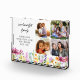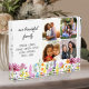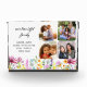 Country wildflower photo block personalised with your custom text, such as "our beautiful family" and the first names of your partner, siblings, kids, in-laws and/or grandchildren for example. The photo template is ready for you to include 4 of your favourite photos, which are displayed in rounded square shapes. The design features delicate watercolor meadow wild flowers in pink orange purple blue and yellow. It is lettered with casual modern script and whimsical typography. Feel free to change the font or background colour to suit (click "edit using design tool").