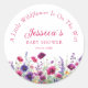 Customer-specific, cute, wildflower, purple-pink, baby shower white classic round sticker with your name & date.