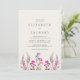 This rustic wedding invitation features a watercolor border of pink and purple meadow wildflowers on an ivory background. Personalise the charcoal grey text with the couple's names in serif font and the wedding details in italics. The back is solid ivory.