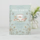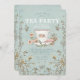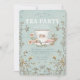 This Tea Party Birthday Invitation features a sweet tea cup adorned with wildflowers on a robin's egg blue background with a delicate leafy vine on both edges. All the birthday party details can be edited by clicking "personalise this template." Colours include rose red, sage green, pale blue, orange, pink and white. The reverse side has the same background colour and leafy vine details.