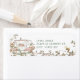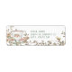 This Tea Party return address label design feature a sweet tea cup adorned with wildflowers on a bright white background with a delicate leafy vine on both edges. Colours include rose red, sage green, pale blue, orange, pink and white.