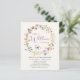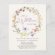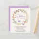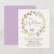 A budget-friendly and elegant light cream baby girl shower invitation featuring "a little wildflower is on her way" in a mix of modern soft grey typography and a stylish lavender purple script, and whimsical boho-inspired watercolors of a wreath of purple, pink, peach and yellow wildflowers and a purple butterfly. Personalise the mother's name and shower details in simple lavender and grey typography.