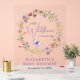 An elegant clear acrylic welcome sign for your baby girl shower featuring "a little wildflower is on her way" written in a mix of modern typography and a stylish lavender script, a boho-inspired watercolor wreath of purple, pink, peach and yellow wildflowers, and a purple butterfly. Personalise the mother's name and shower date.
