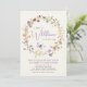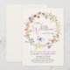 An elegant light cream baby girl shower invitation featuring "a little wildflower is on her way" written in a mix of soft grey typography and a stylish lavender purple script, and boho-inspired watercolors of a wreath of purple, pink, peach and yellow wildflowers and a purple butterfly. Personalise the mother's name and shower details in simple lavender and grey typography.