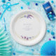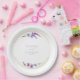 This elegant wedding collection uses a striking colour palette including periwinkle, plum and soft blues to create matching stationery and party supplies for your special day. Watercolor florals and sparkling paint strokes provide eye-catching backgrounds. Handwritten script paired with a classic serif font lend a modern touch. The wedding paper plate shown here with a floral border, provides a template to easily add your own names and wedding date. Search ID954 to see other pieces and colour choices for this set.