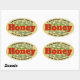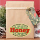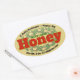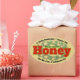 Honey jar sticker with a bouquet of clover or wildflowers tied in a wreath, and customised text for the name of the beekeeper or apiary business, contact information, net weight, and bold text for the word "Honey" (or Miel, Miele, or Honig in other languages). Use the optional text for the type of honey, product qualities (unfiltered, dark amber), country of origin, or related products like creamed honey and honey candy. © dotpattern