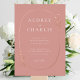 An elegant wedding invitation design features white typography on a clay coloured background, surrounded by a delicate oval shaped wildflower wreath. The wreath is crafted from a variety of dainty wildflowers in rose gold foil, creating a soft and romantic look. The typography is elegant and sophisticated, with a classic serif font that adds to the overall charm of the invitation.