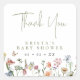 Stylish boho baby shower favour stickers featuring "Thank You" in sage green modern handwritten style font, and a bottom boarder of watercolor wildflowers and butterfly. Personalise with your details.