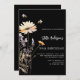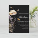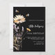 A black background. Decorated with bees and painted wildflowers in violet and pink. Personalise and add a name and party details. White text.