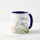 Custom script personal name Coffee Mug. A meadow full of watercolor wildflowers, butterflies and dragonfly. The name on both sides is in a peach script font with attached swirls/glyph on each side of the name for a feminine touch. You can keep them or delete. Try to write your name between the square icons and see before you decide.