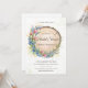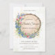 Watercolor Wildflowers & Blueberry Rustic Bridal Shower Invitation Card. Romantic style with blueberries, lavender flowers, clover, and eucalyptus is perfect for a rustic summer wedding. The basis of the composition is a wreath of wildflowers and a wood circle. Watercolor splatter complements the composition of flowers and berries and gives it a special charm.