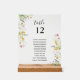 Table sign with table number and guests names, small seating chart table top sign featuring watercolor wildflowers.