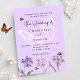 A violet background. Decorated with bees and painted wildflowers in violet and pink and a large butterfly. Personalise and add your names and the details.