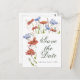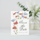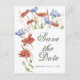 Save the date postcard featuring a cascade of watercolor meadow wildflowers such as red poppies blue cornflowers and grass.