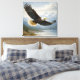 A powerful bald eagle soars confidently above a tranquil northern lake, its wings fully extended in graceful command of the open sky. Snow-capped mountains rise in layered blues behind it, while evergreen forests and calm waters stretch below, capturing the vast beauty of the Alaskan wilderness. The eagle’s crisp white head and tail contrast with its deep brown feathers, highlighted by a golden beak and talons that gleam against the cool mountain air. The scene conveys motion, freedom, and the untamed spirit of the North—both majestic and serene.