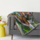 A quality printed throw has its advantages. This is a much finer weave throw than its loopier cousins, and though lighter, it is worth the investment for custom room accessorizing. The back is much prettier than the typical brown, and the fringe on the long sides very vivid, the selvage nicely done. Before photographing, I washed the throw in cold water, delicate, with a thicker woven throw the same size. On tumble dry low, this throw was dry in half the time as the other. This is a very practical quality if you use throws for furniture covers or to wrap up in frequently. The sleekness of the fabric makes it a great layer for accenting or protecting without the feeling of sitting on too much stuff. Perfect for napping or when you feel a light chill coming on. The color printing is beautiful and on this fabric, matched the design and color of my Photoshop image. This is an advantage for blending room fabrics and colors. The fringe on the short sides prints the colors from the design image and therefore varies from the side fringe. I streaked a white fractal line through the plaid pattern to give the illusion of weaving. This printed as crisp as an illusory thread, and put some white in the short side fringe, showing another advantage of print vs loomed- for artistic purposes, line lines, detail, and color integrity can be planned and preserved. My loomed throws have color limitations and more of a needlepoint texture. Print throws reproduce an exact image. The throw felt a little stiff straight out of the package, but this went away in the first delicate wash. Of course I searched the wash water for ink or bleeding and there was none.