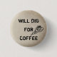 This button has the words "will dig for coffee" in capital black letters, in a rustic, worn font, and a small, funny, cartoonish rocket-propelled espresso cup on a side, on a beige, grey and brown earth background. It is a funny gift idea for an archaeologist or a palaeontologist, or any other person whose work involve digging, and who consumes too much caffeine for their own good... that is, pretty much every archaeologist I have ever met ;)