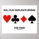 No need to be an avid duplicate bridge player to enjoy this poster featuring the four card suits along with the saying that will make other bridge players do a double-take at what you're willing to do: "Will Play Duplicate Bridge For Food".