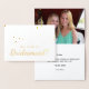 This bridesmaid fold over card offers branches of palm leave across the top of the front in gold foil and text that reads: Will you be my bridesmaid?. The inside features a photo frame for your favourite photo and custom text of a personal message to your friend. This is a perfect and classy way to make your bridesmaid proposal special.