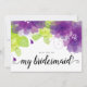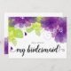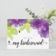 "Will you be my bridesmaid?" purple ethereal flowers floral spring wedding card. A pretty design that showcases purple flowers with green leaves and cursive script style handwritten calligraphy .