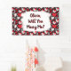 Personalised marriage proposal banner. Pretty red, black and white hearts and flowers pattern background.