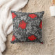 Throw pillow in a vintage William Morris floral damask pattern of anemone flowers and leaves, digitally enhanced and coloured - light silver grey / grey leaves, and flowers in shades of deep lipstick red on a dark graphite grey background