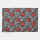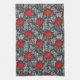 Kitchen towel in a vintage William Morris floral damask pattern of anemone flowers and leaves, digitally enhanced and coloured - light silver grey / grey leaves, and flowers in shades of deep lipstick red on a dark graphite grey background