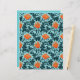 Paper in a vintage William Morris floral damask pattern of anemone flowers and leaves - deep indigo blue leaves, and flowers in shades of coral orange on a light chambray blue background