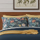 A beautiful, intricate William Morris floral pattern featuring stylized flowers in salmon, teal, yellow, and cream against a deep navy background. The back is a beautiful complimentary navy blue. Perfect for adding timeless Arts Crafts decor style to any bedroom. This classic, rich design is ideal for fans of historic textile prints. Created by Simply Farmhouse Press.