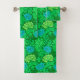 Towel set in a vintage William Morris, Art Nouveau, floral print of stylised chrysanthemums, digitally enhanced and coloured, in light and deep lime green and aqua, on an emerald green background