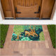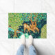 Doormat in a William Morris tapestry design of three deer beside a brook in a fantasy forest setting of trees in shades of soft green and aqua, against a dark indigo blue background