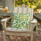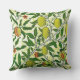 Outdoor pillow in a William Morris Art Nouveau pattern of lemons, pomegranates, and peaches, with blossoms, on leafy branches - fruit in yellow and coral orange, with green leaves, against a patterned, yellow and white background