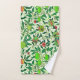Towel set in a William Morris Art Nouveau pattern of lemons, pomegranates, and peaches, with blossoms, on leafy branches - fruit in lime green and coral orange, with green leaves, against a patterned, lime green and white background