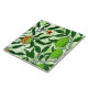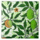Ceramic tile in a William Morris Art Nouveau pattern of limes, and peaches, with blossoms, on leafy branches - fruit in lime green and coral orange, with green leaves, against a patterned, lime green and white background