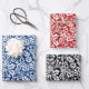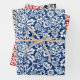 Wrapping paper in a vintage William Morris floral damask pattern, digitally enhanced and coloured, in white on deep cobalt blue, dark red, and black