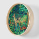 Clock in a William Morris tapestry design of deer in a fantasy forest setting - tan speckled deer in a lush, deep blue and green background of leaves and flowers, accented with red tulips
