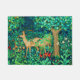 Doormat in a William Morris tapestry design of deer in a fantasy forest setting - tan speckled deer in a lush, deep blue and green background of leaves and flowers, accented with red tulips
