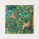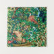 Tapestry in a William Morris design of a fox and a pheasant in flight in a fantasy forest setting of leafy green foliage and fruit trees