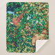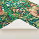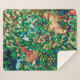 Sherpa Blanket in a William Morris tapestry design of a fox and a pheasant in flight in a fantasy forest setting of leafy green foliage and fruit trees