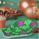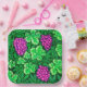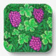 Paper plates in a vintage William Morris tapestry pattern of magenta / red-purple grapes against a background of green vines and leaves, digitally enhanced and coloured