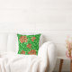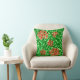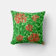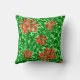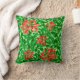 Throw pillow in a William Morris Art Nouveau pattern of honeysuckle flowers against a background of vines and leaves - flowers in shades of coral orange and coral red, with emerald green leaves, against a pastel green background