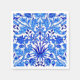 Paper napkins in a vintage William Morris pattern of hyacinths, tulips and leaves, in shades of cobalt and cerulean blue, accented with dark navy, on a white background