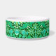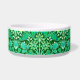 Pet bowl in a vintage William Morris pattern of hyacinths, tulips and leaves, in shades of emerald and jade green, accented with aqua and white, on a deep forest green background