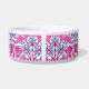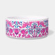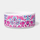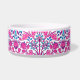Pet bowl in a vintage William Morris pattern of hyacinths, tulips and leaves, in shades of fuchsia and soft pink, accented with dark blue and turquoise, on a white background