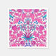 Paper napkins in a vintage William Morris pattern of hyacinths, tulips and leaves, in shades of fuchsia and soft pink, accented with dark blue and turquoise, on a white background