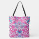 Printed tote bag in a vintage William Morris pattern of hyacinths, tulips and leaves, in shades of fuchsia and soft pink, accented with dark blue and turquoise, on a white background