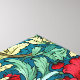 An stylish floral pattern of red flowers and leaves on a blue background, inspired by the famous English Arts and Crafts designer William Morris.