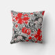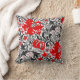 Throw pillow in a vintage William Morris floral print of stylized lilies and Irises, digitally enhanced and colored, in shades of gray / grey and black foliage, with deep red flowers,on a white background