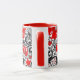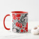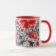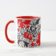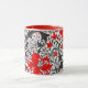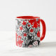 Coffee mug in a vintage William Morris floral print of stylised lilies and Irises, digitally enhanced and coloured, in shades of grey / grey and black foliage, with deep red flowers,on a white background